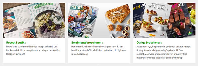 Därefter går det att lägga deck med puffar till andra sidor. Puffarna kan läggas i rader med två eller tre puffar per rad görs antingen manuellt med bild, text och länk. Eller så går det att göra puffar med produkter eller recept. Då går det att dra-och-släppa färdiga produkter- eller receptblock från det högra resursfönstret in i puffarna.