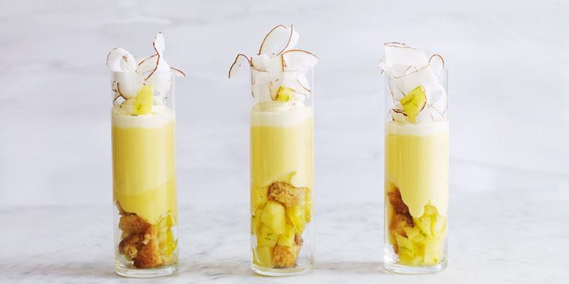 - Lägg marinerad ananas i portions-glas med bitar av kokosbotten. Spritsa på passionsfruktscurd, mangomousse och smetana.