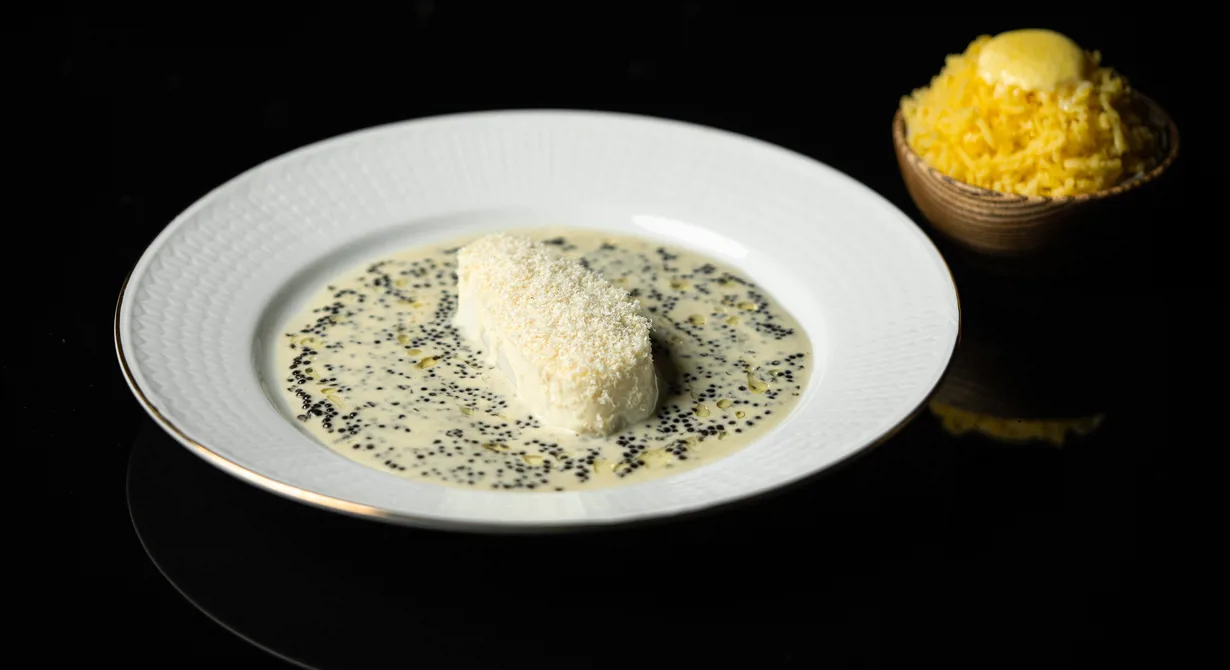 Den här rätten har fått smöriga toner i så många delar som möjligt. Smörig sås, smörigt ekfatslagrat vin, cashewnötter och den smöriga potatissorten andean sunside. Piggvaren är elegant och sältan från caviaren fångar upp det feta. Smakerna i rätten är rena och lätta att tycka om.