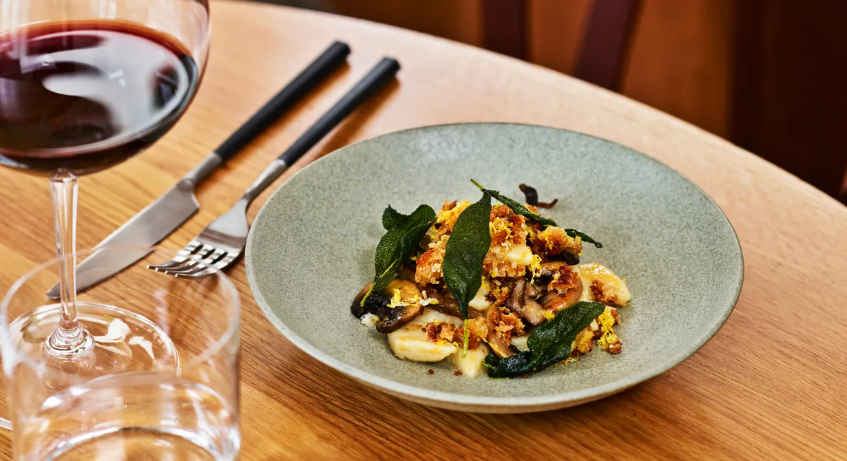 Gnocchi är en trevlig mellanrätt att ha på sin barmeny. Osten Gnalling sätter smak på både gnocchin och såsen. Smörstekta brödsmulor med timjan och citron ger crunch till rätten och svamp och salvia en härlig touch av höst. Allt kan vara förberett och bara snabbt kokas, smaksättas och garneras vid servering.