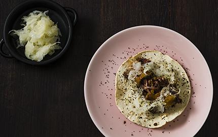 Mört, trådigt lammkött ihop med picklad fänkål och lakrits ger en modern mexikansk tacoupplevelse. Fänkålen förstärker lakritssmaken.