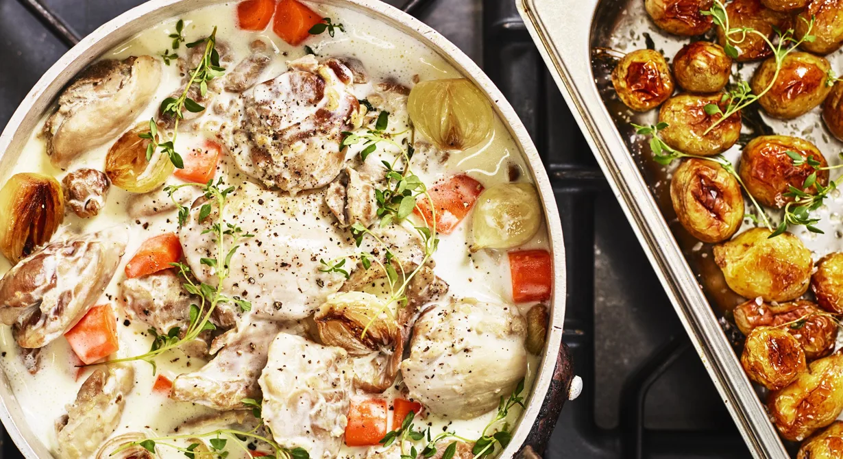Den ljusa färgen och den mjälla kycklingen kombinerat med friskt vitt vin och gräddig sås med hög syra. Det händer något med denna klassiker till gryta när man byter ut det röda vinet mot vitt. Det känns lättare och piggare.