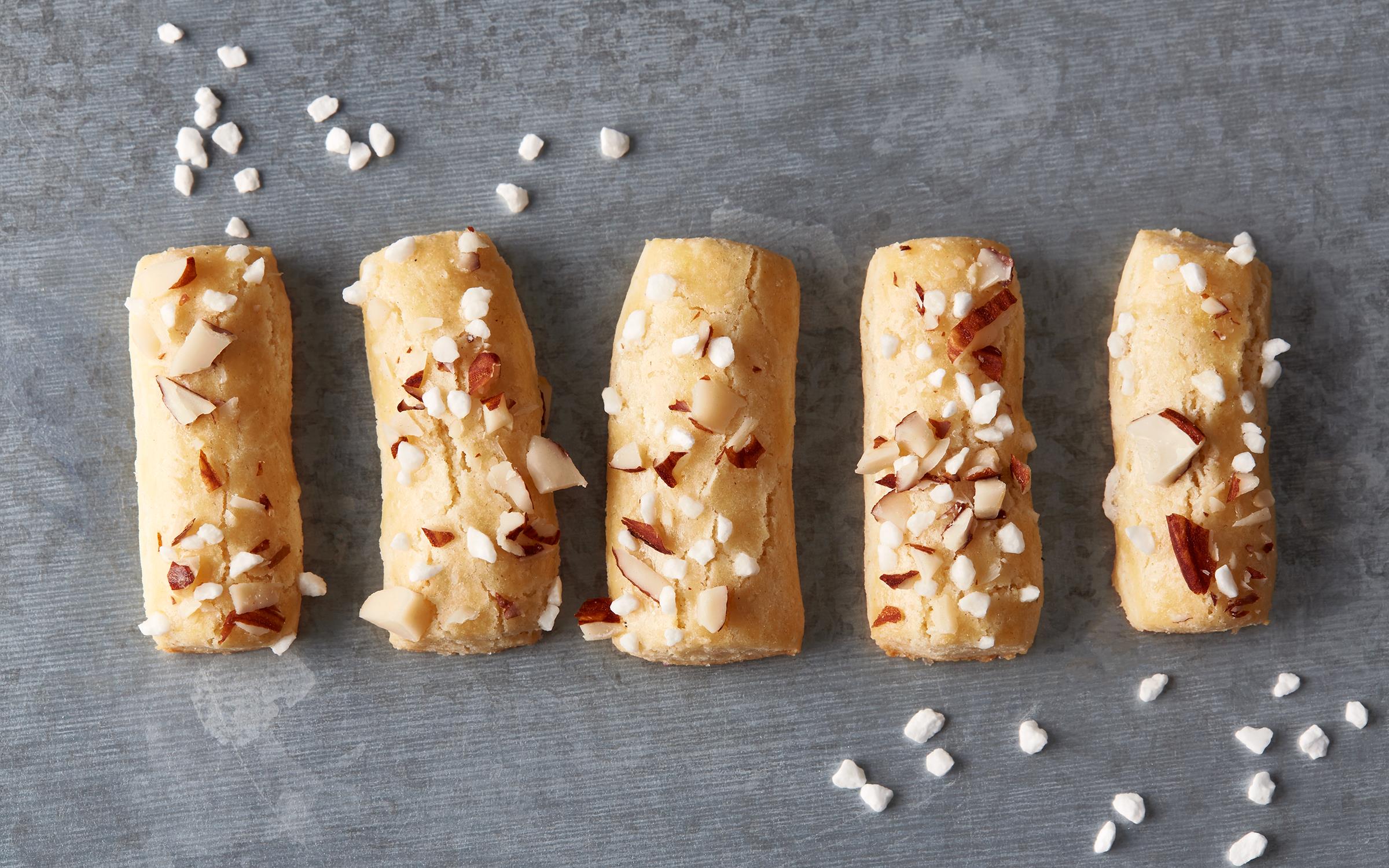 Ljuvliga små mördegskakor med mandel och pärlsocker. Det här är en enkel variant av den populära finska pinnen. Det klassiska receptet innehåller finmalen sötmandel som saknas här.