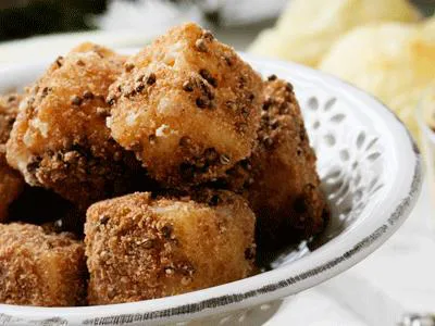 - Fritera ostbitarna i olja, 180° till fin färg. Servera genast.