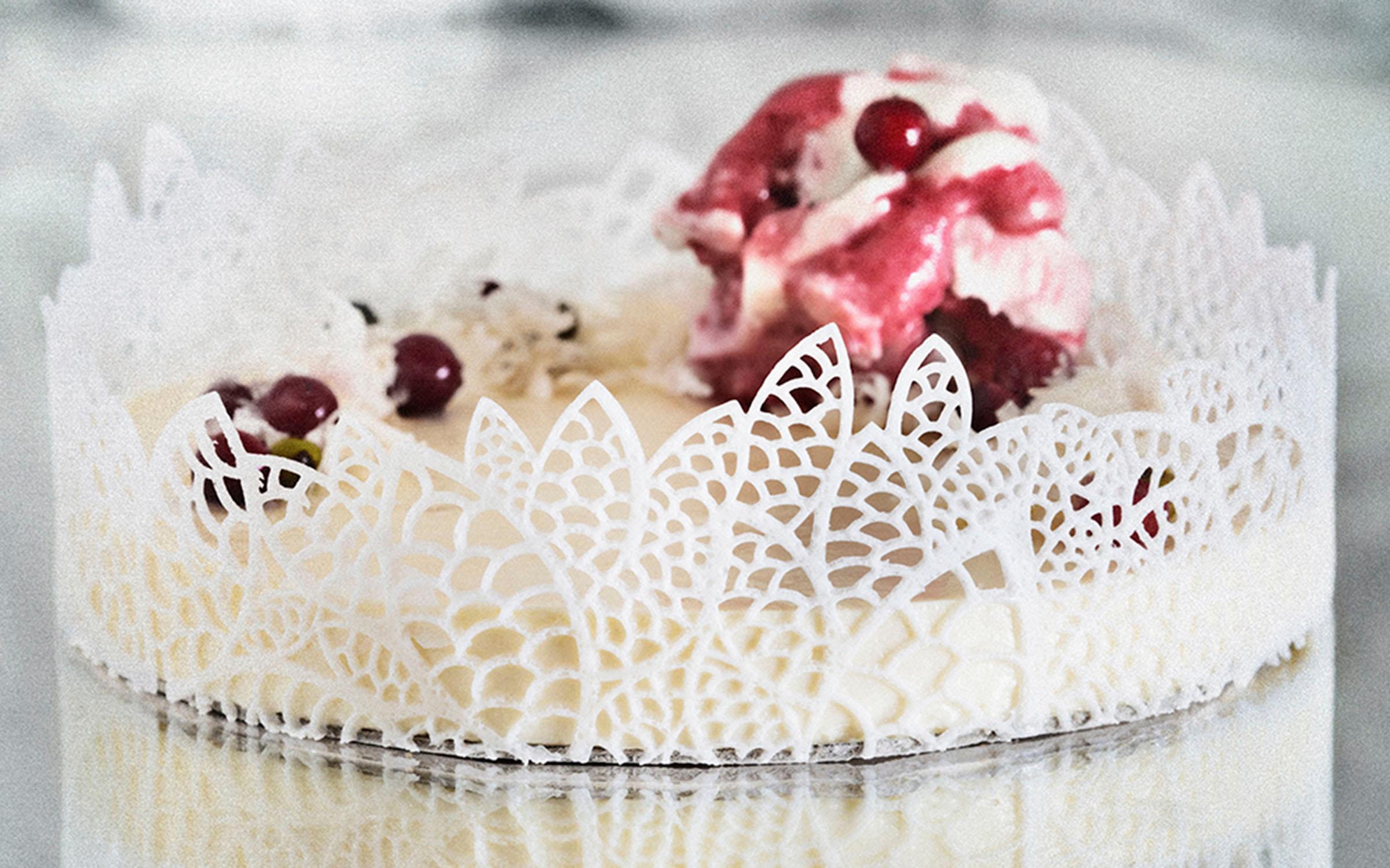 Den vackra desserten består av yoghurt som smaksatts med hasselnötter och vit choklad och serveras med ett fluffigt änglamos av grädde och lingonsorbet. En dessert som passar bra på vintern och vid juletid.