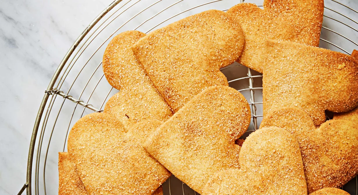 Fina små hjärtan av mördeg som pudras med socker och kanel. Perfekta småkakor att sälja till jul men goda året om.