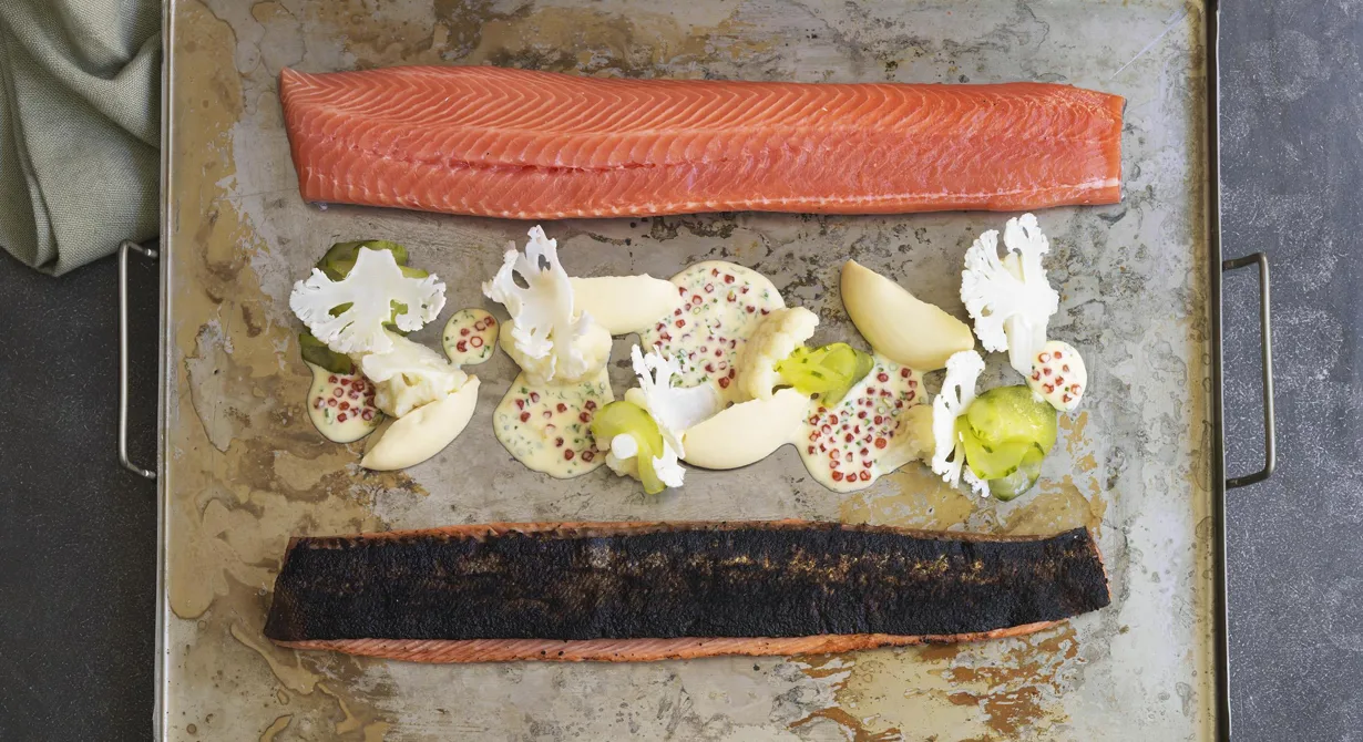 En lyxig lunchrätt med sotad, gravad forell, blomkål i olika versioner och picklad gurka. Den lena och fylliga purén samt såsen med vassle och forellrom får en smakskjuts av miso.