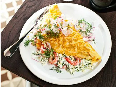 - Fyll omeletterna med cottage cheese och räkor. Strö över rädisor och dill.