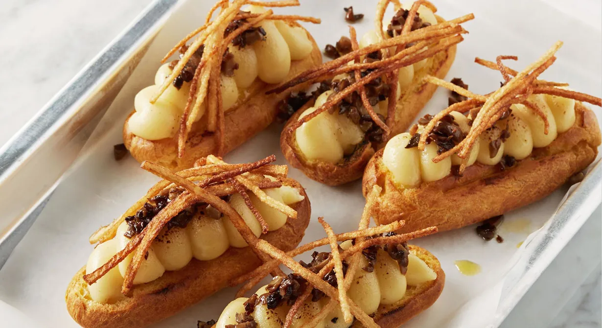 - Ta av toppen på éclairerna. Spritsa på potatiscrème och bränn av lätt med en brännare. Garnera med rostad karljohanssvamp och friterade potatisstrimlor.