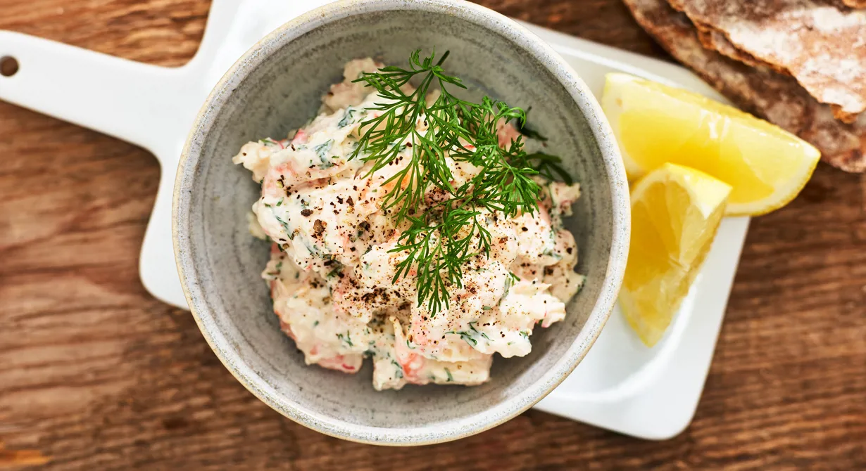 - Blanda crème fraiche och majonnäs. Vänd ner dill, pepparrot och slutligen räkorna. Smaka av med salt och peppar.