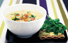 - Koka kött, lök, rotfrukter, korngryn och kryddor i buljongen ca 15 min. Red av med mjöl, koka ca 5 min. Tillsätt grädde och koka på svag värme ca 5 min. Rör ner smält smör och smaka av med salt och peppar. Strö över persilja vid servering. Servera gärna knäckebröd med ost till soppan.