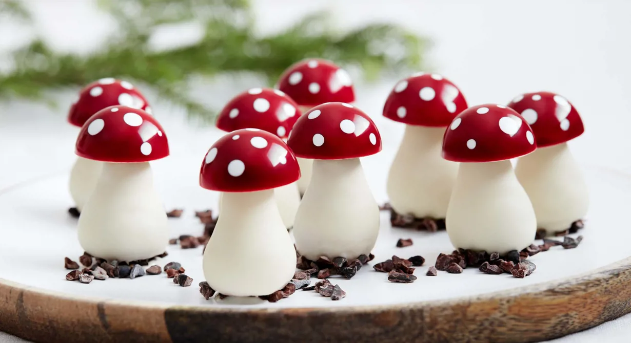 - Locka med tempererad vit choklad, kyl och knacka pralinerna ur formen. Limma en pralin på varje svampfot med lite vit choklad. Ställ på fat med kakaonibs.