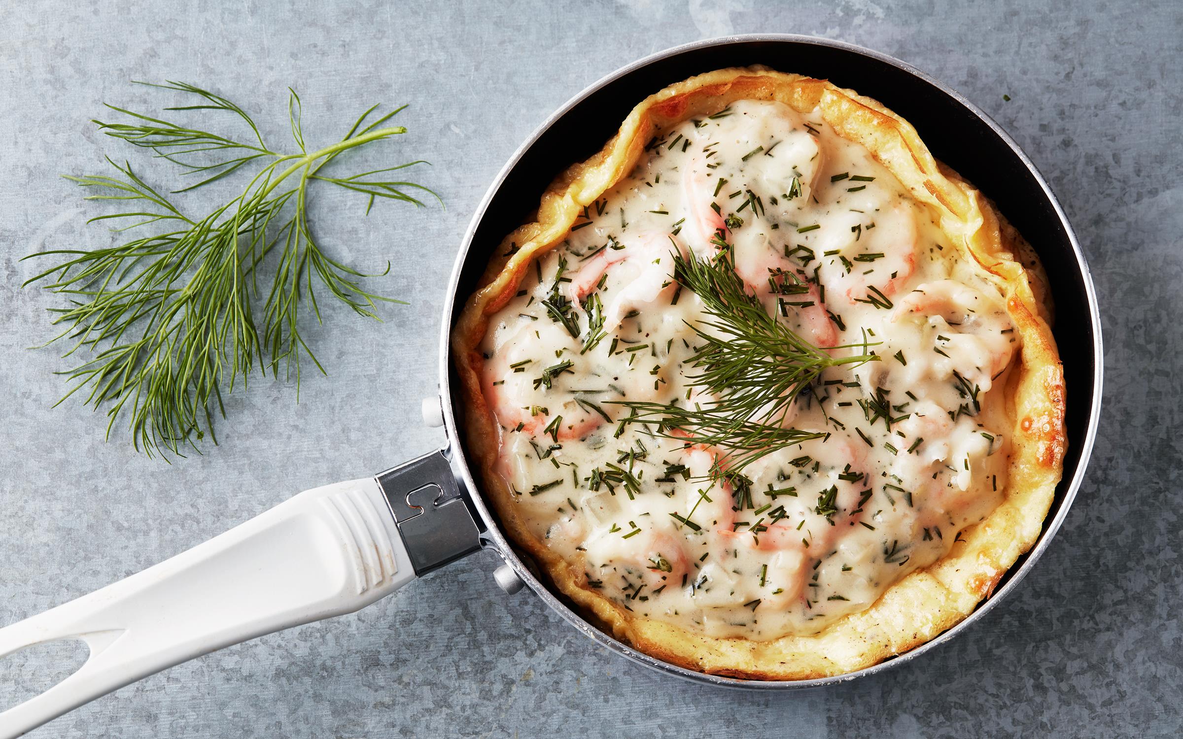 - Strö över mjöl och häll på grädde, låt koka ihop ca 3 min. Rör i räkor och dill. Smaka av med salt och peppar.