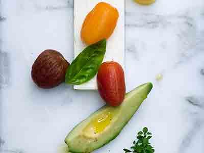 - Skär en skiva av terrinen, garnera med tomaterna, klyftad avokado, mixad avokado, örter och nappera ev med lite pickelslag.